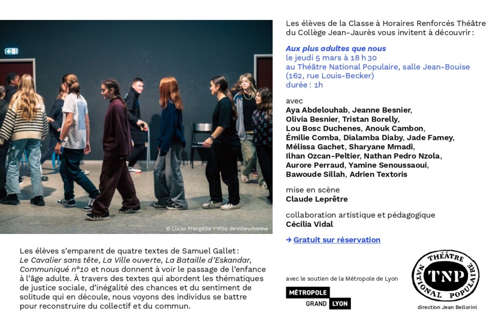Les représentations de la CHRT (classe à horaires renforcés théâtre) se feront au TNP le jeudi 5 mars à 14h et 18h30 en salle Jean Bouise.